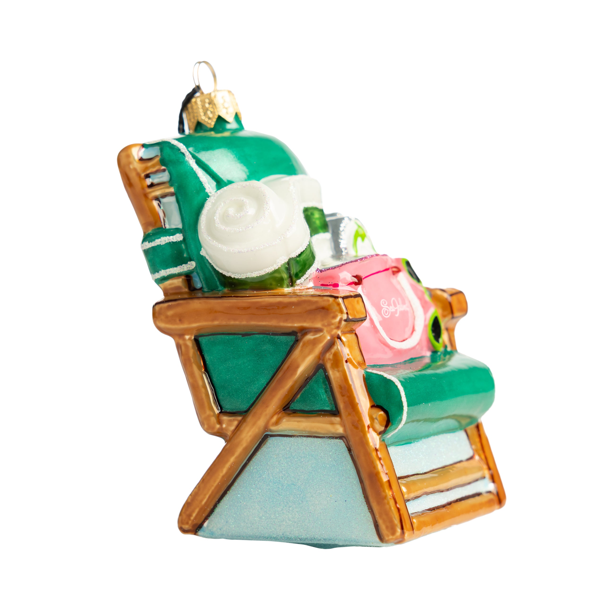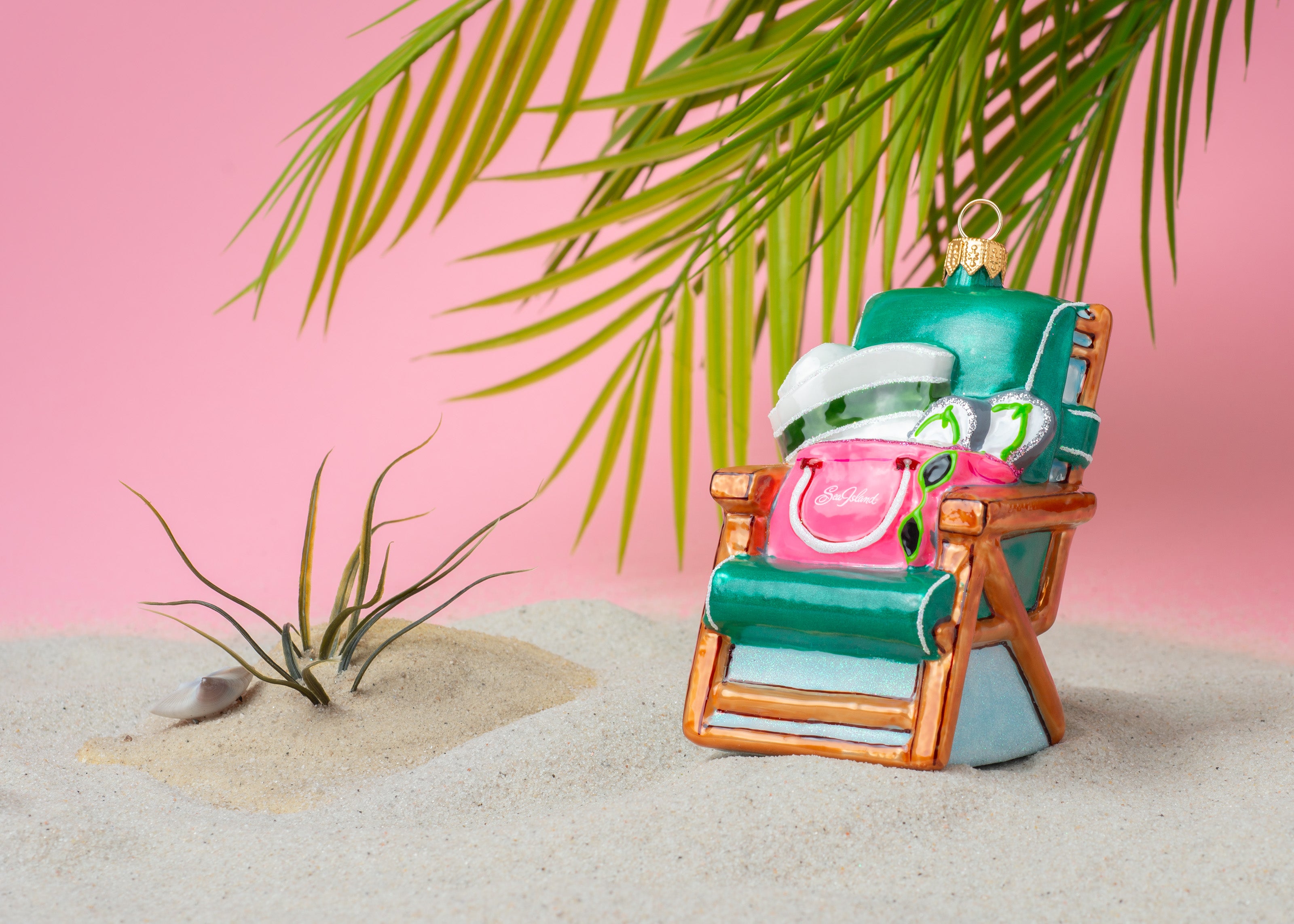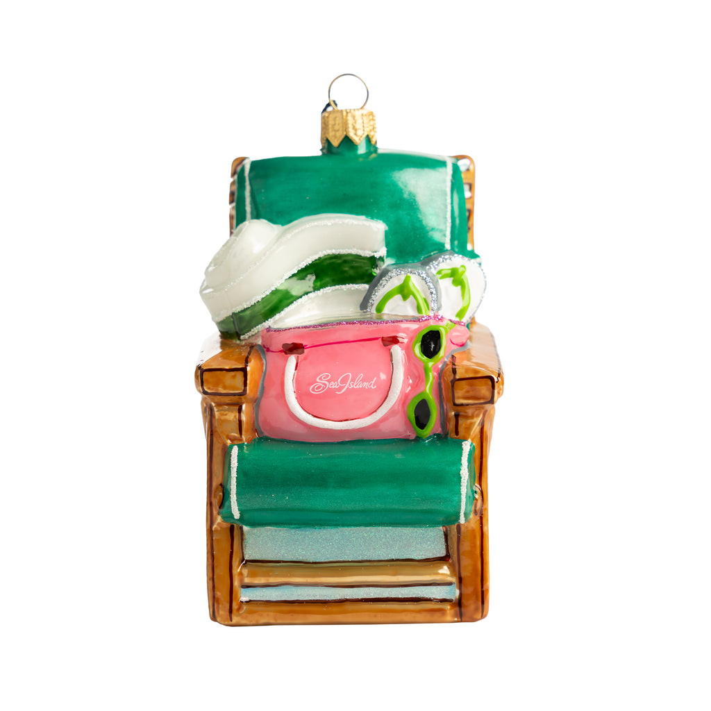 Inspired by the iconic Sea Island Beach Club, this custom ornament beautifully captures the spirit of seaside relaxation. Featuring our signature green and pink tones and the classic Sea Island script, it’s a timeless keepsake that brings a touch of the Beach Club’s coastal elegance to your holiday décor. The backside of the chair features the Sea Island script in white.